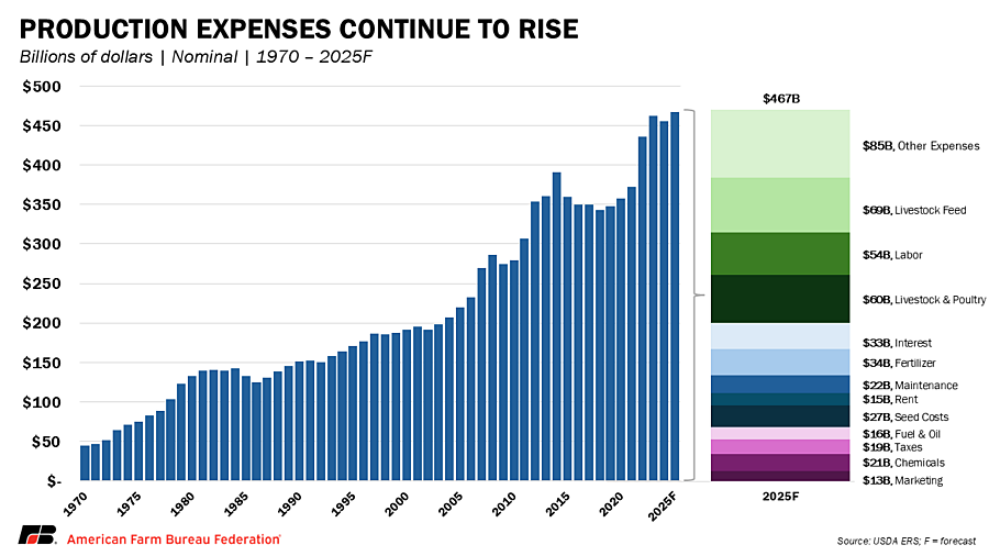 As crop revenues continue to decline, expenses remain stubbornly high, leaving farmers with very few options beyond drawing down equity, tapping reserves or taking on more costly debt. Production expenses in 2025 are projected at record levels of $467 billion, nearly $12 billion higher than 2024 (up 2.6%), $50 billion above the previous five-year average (12%) and $85 billion above the previous ten-year average (21%). Each major cost category tells the same story: inputs remain elevated, eroding profitability and making it harder for farmers to reinvest in their operations or build financial reserves.